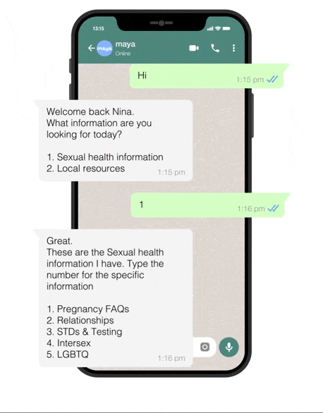 Learn about Maya Health by talking to our chatbot. We have gathered common questions about sexual and reproductive health from various organizations to provide you with helpful information.